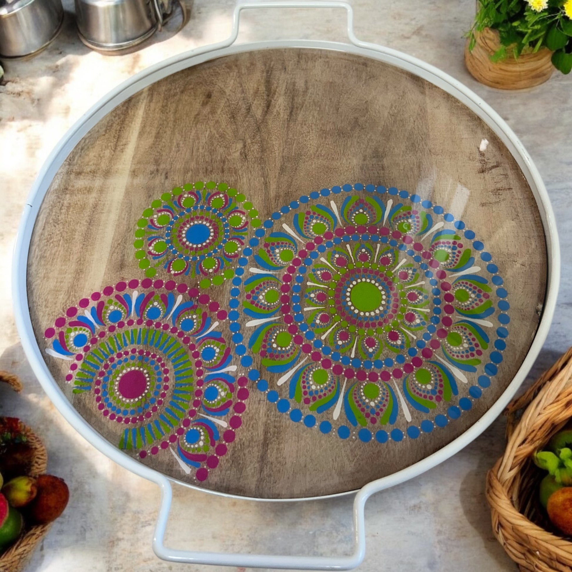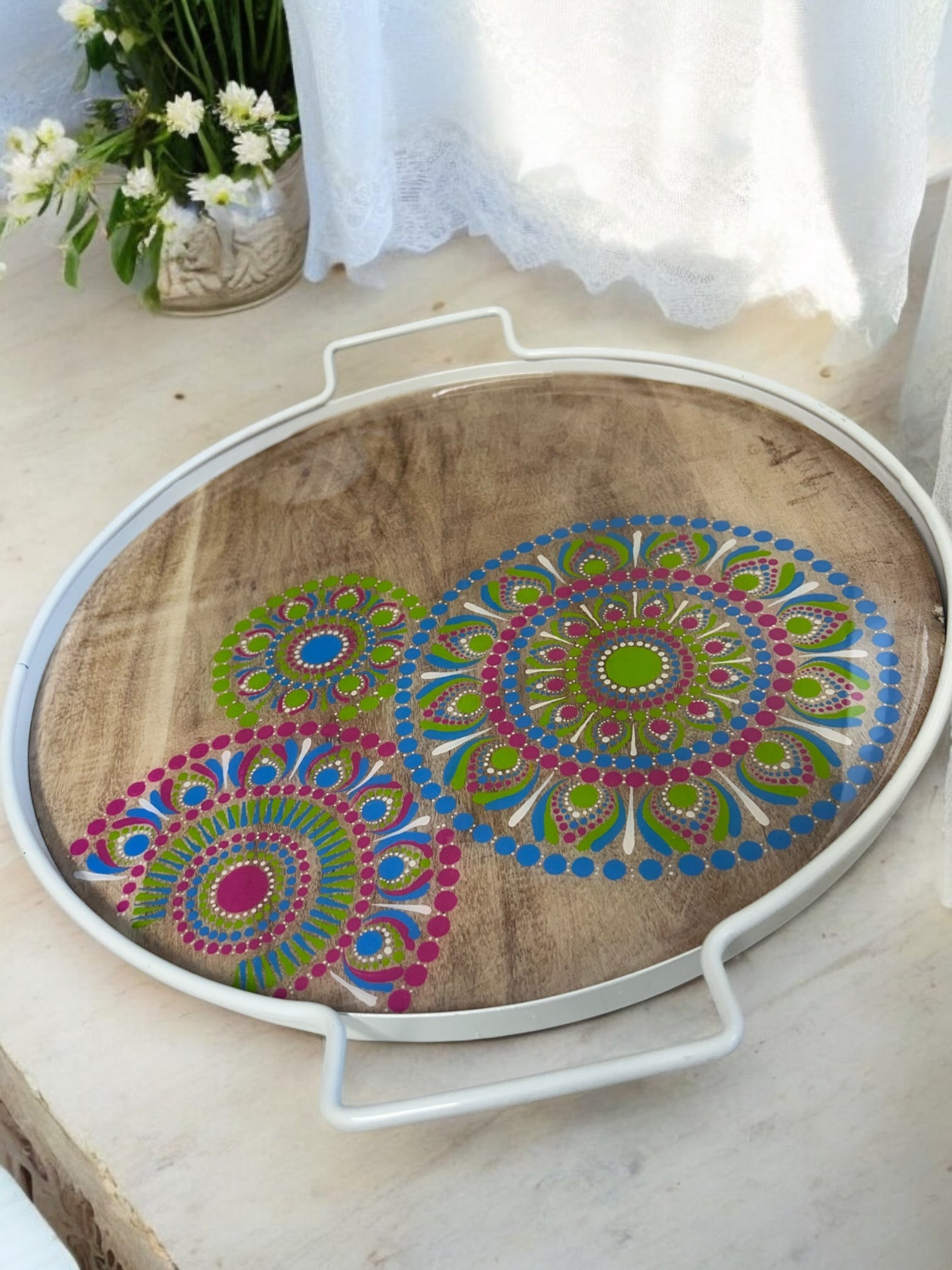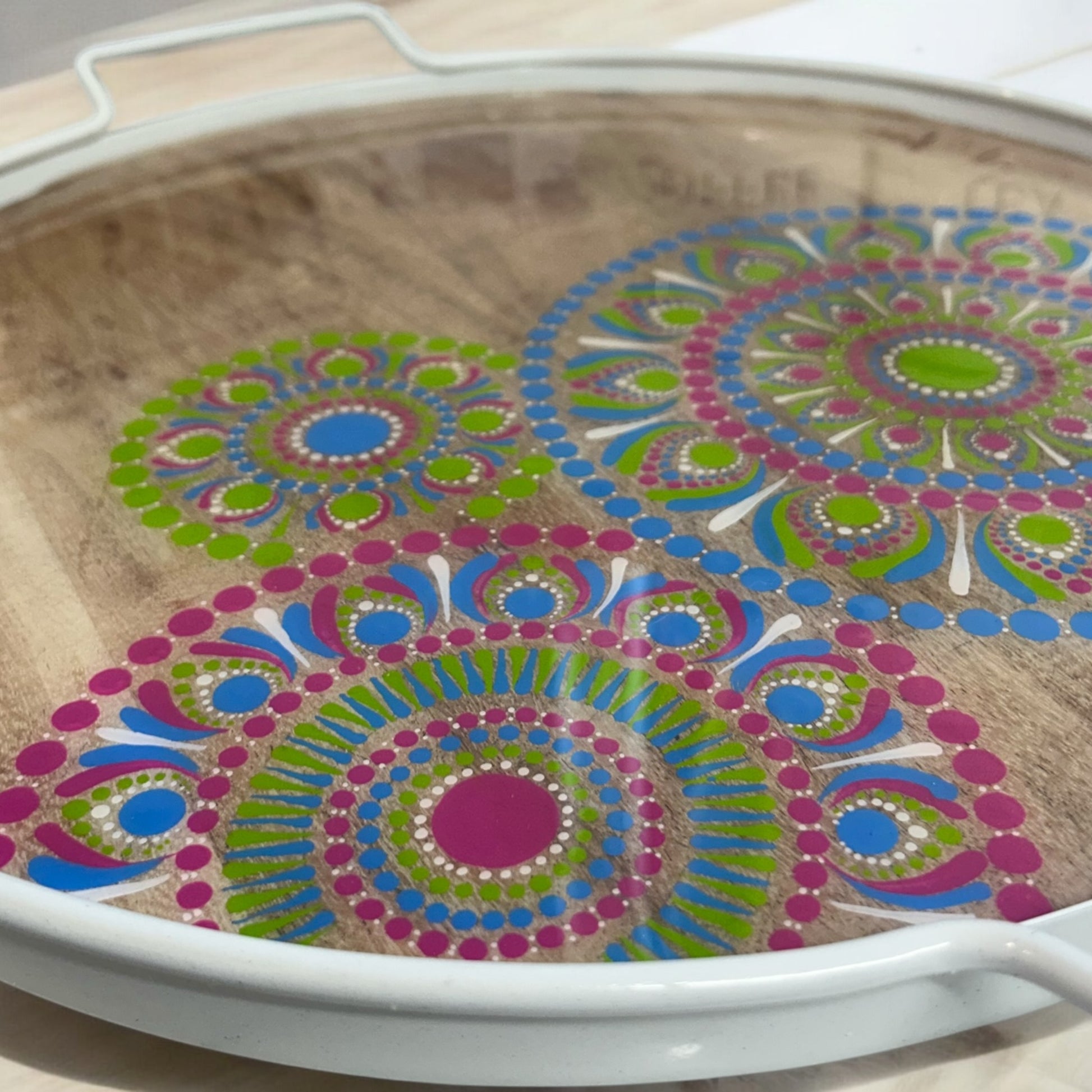 Each piece is meticulously hand-painted with a distinctive mandala design, ensuring that every tray is truly one-of-a-kind. Sized perfectly at 4.5cm high x 46cm wide (including the handles, and 40cm in diameter, it seamlessly fits into any occasion.