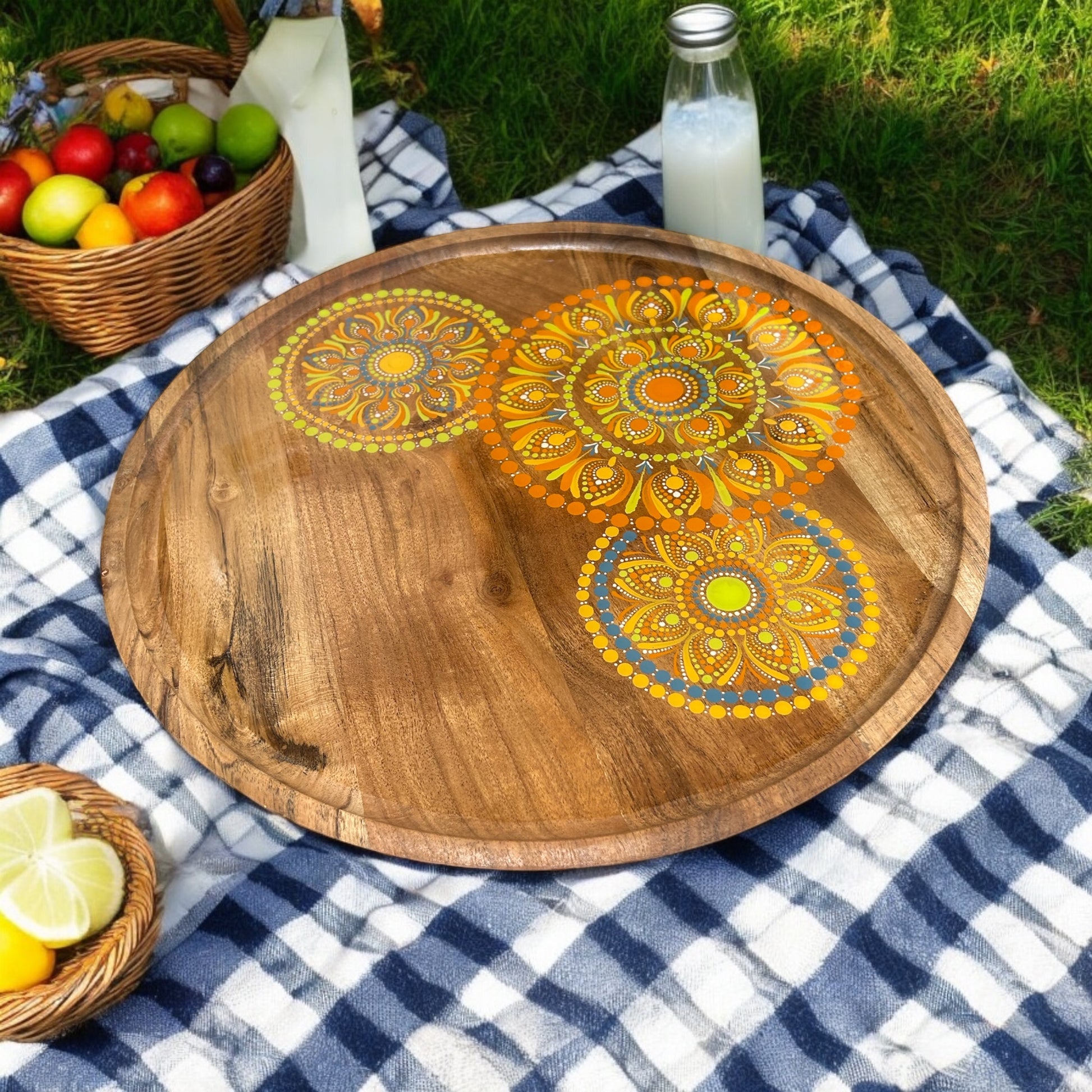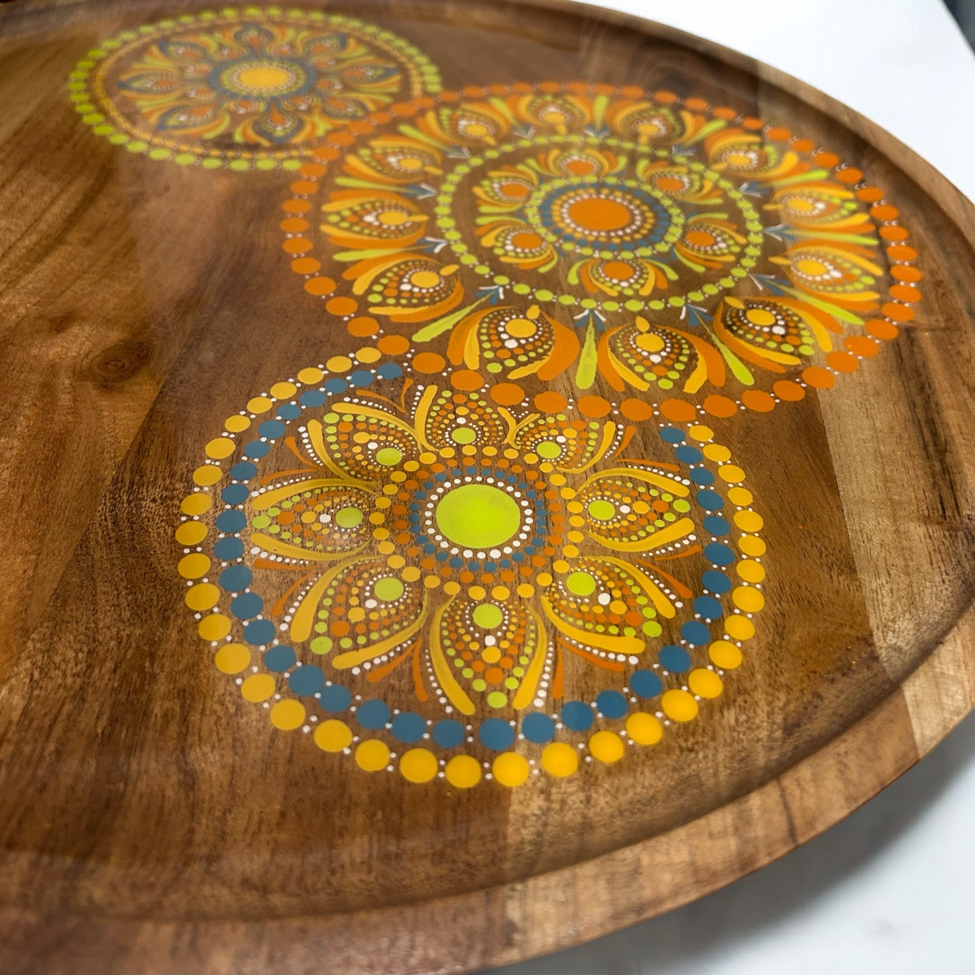 Discover the perfect blend of versatility and charm with this stunning 40cm acacia serving tray! Whether you're searching for a unique gift or a striking addition to your home decor, this tray fits the bill perfectly. Imagine serving drinks at your next party, offering coffee and cake, or presenting delightful nibbles on this exquisite piece. Each tray is a one-of-a-kind work of art, finished with food-safe resin for a protective, glass-like sheen that ensures it stands out while remaining practical. It's a gift that promises to deliver joy for years to come. Remember, to maintain its pristine condition, it's best to avoid using sharp objects on the resin surface.