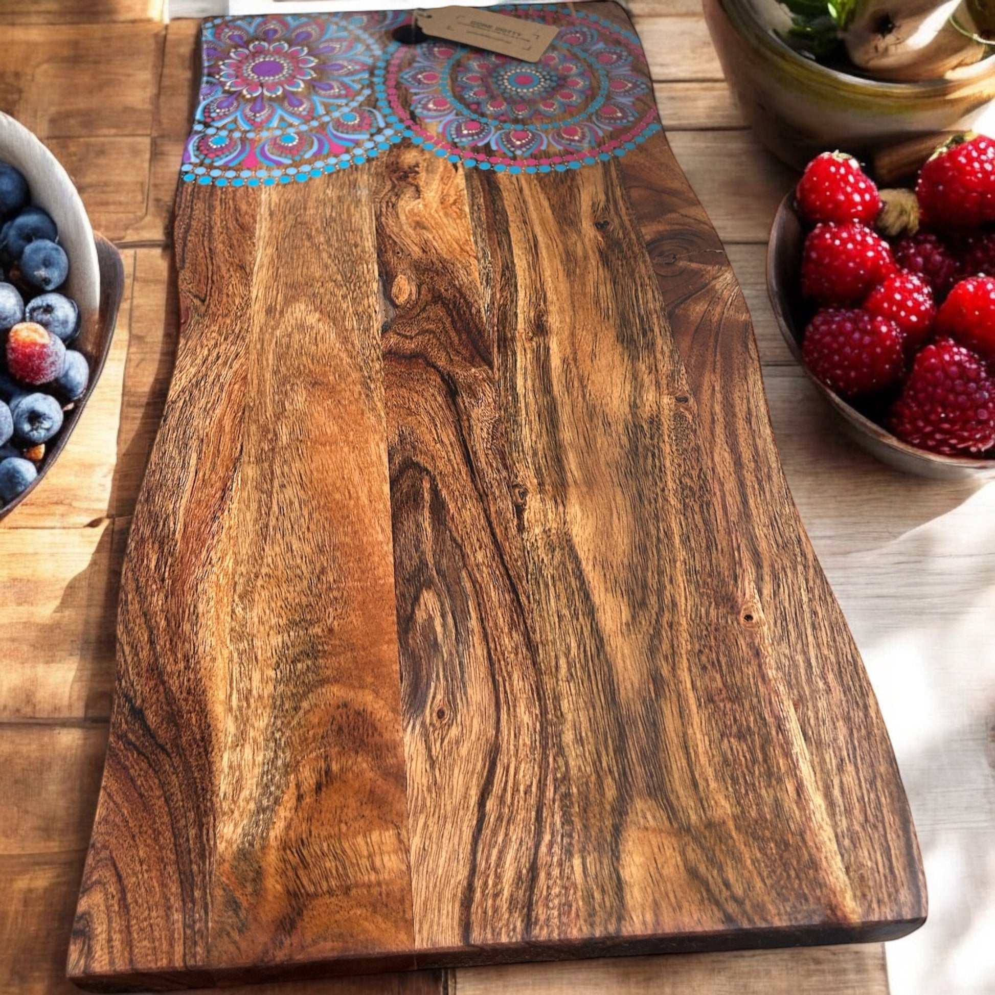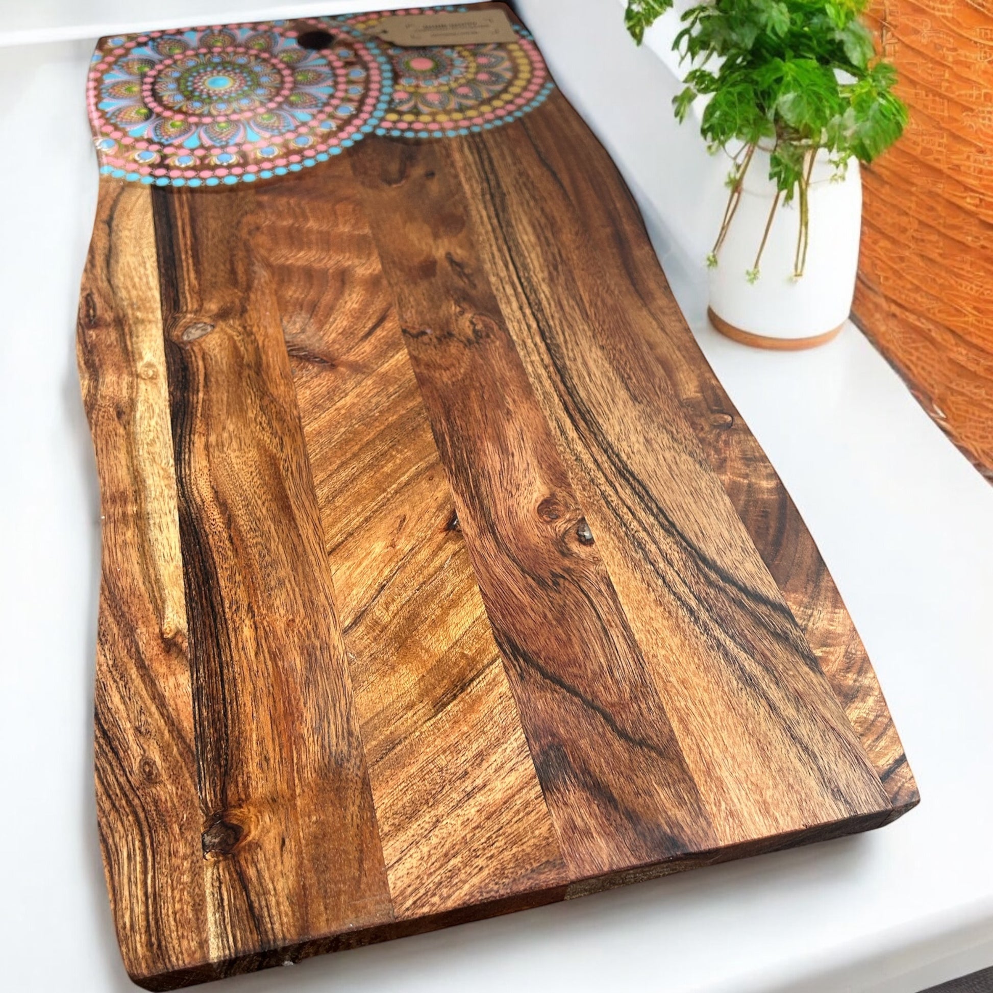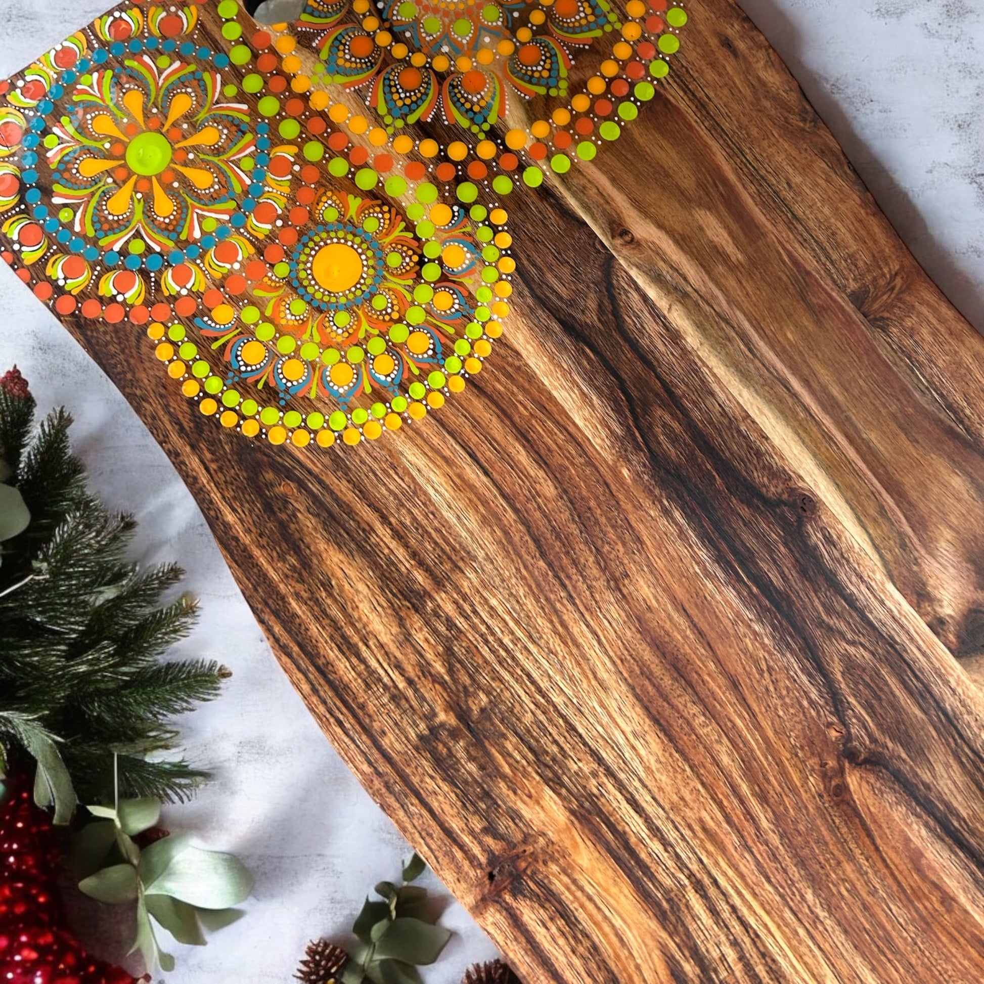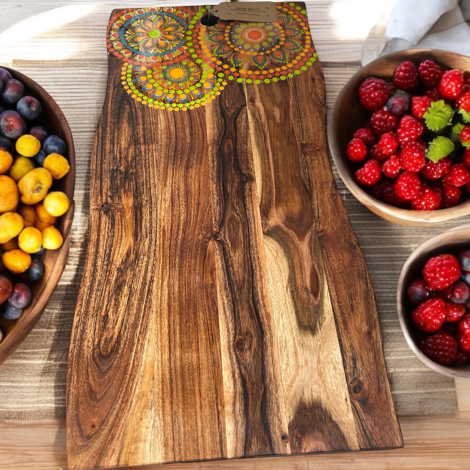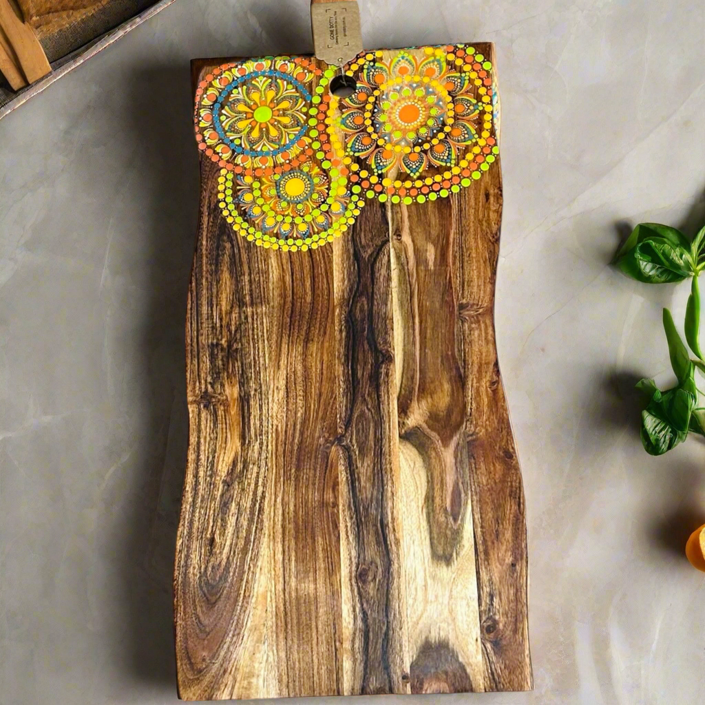 Each board features a vibrant hand painted design sealed with food-safe resin, while the acacia wood's natural beauty is preserved with a layer of vegetable oil, making it both functional and a work of art.