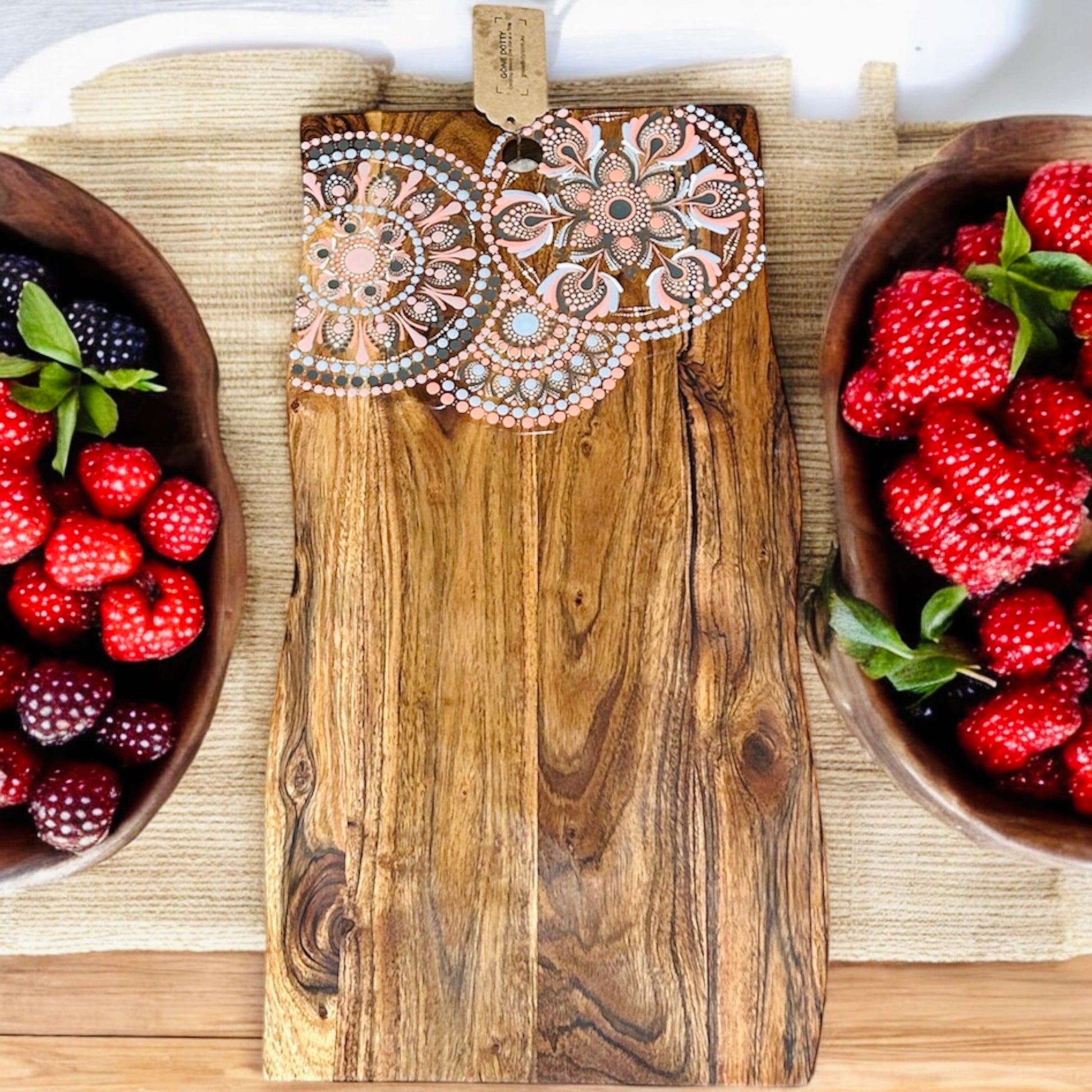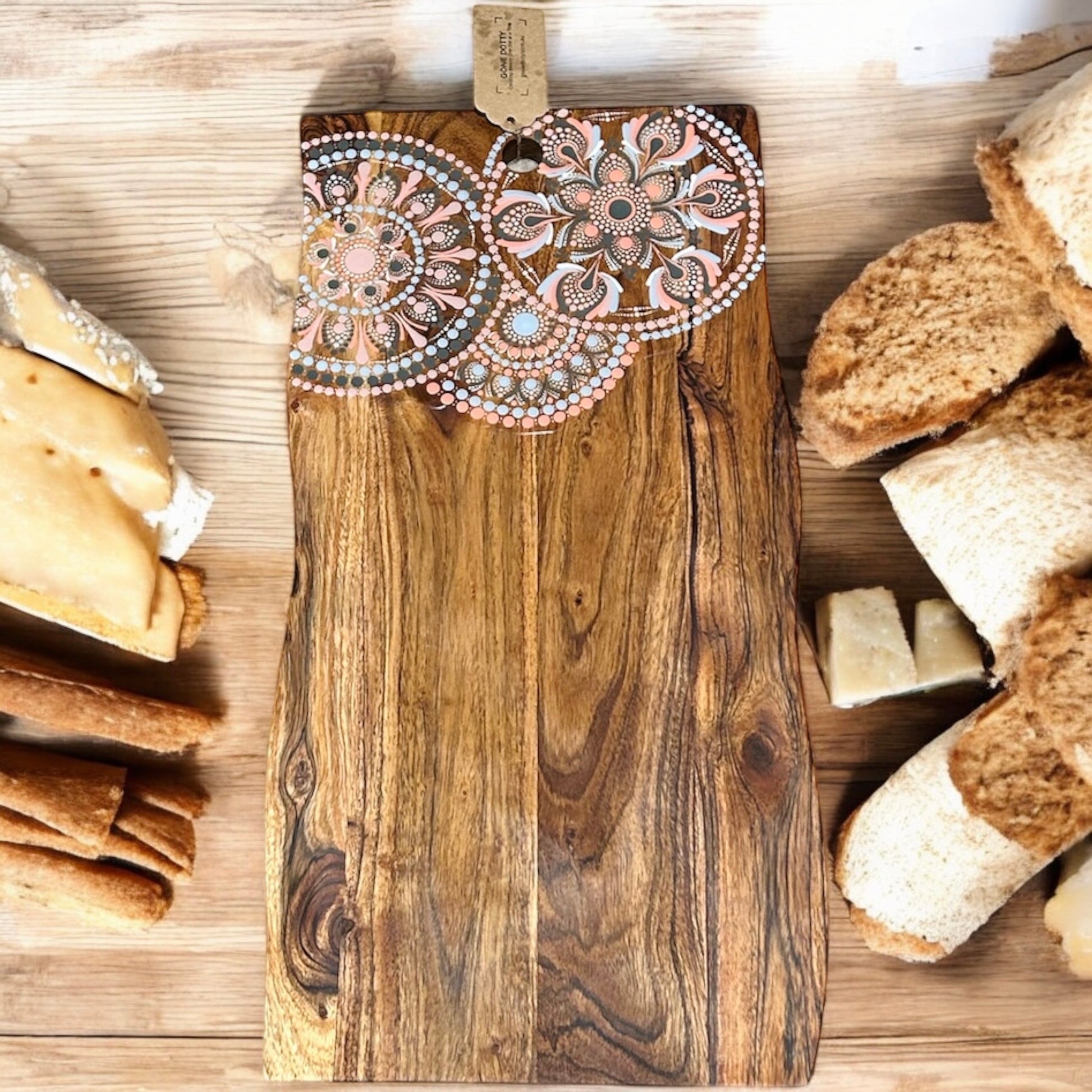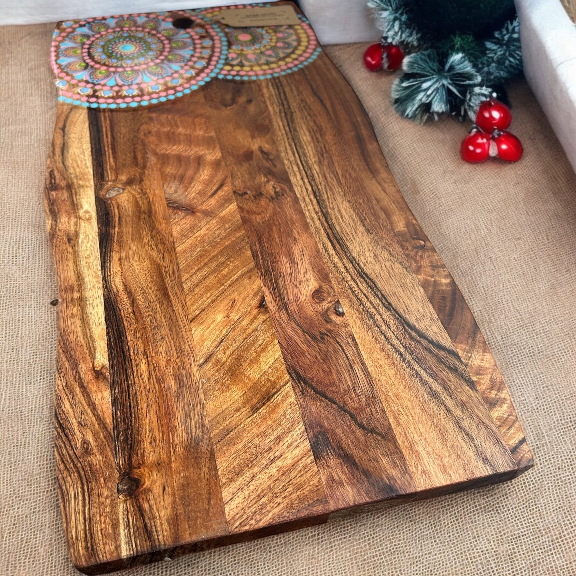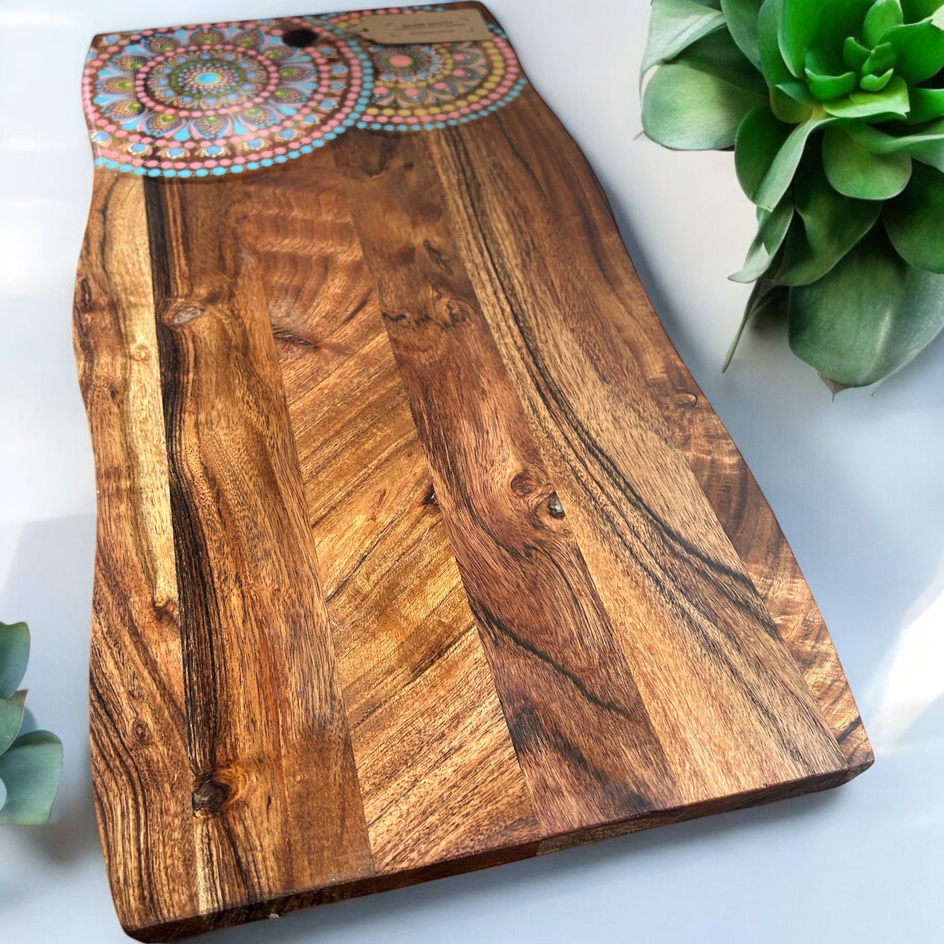 Each board features a vibrant hand painted design sealed with food-safe resin, while the acacia wood's natural beauty is preserved with a layer of vegetable oil, making it both functional and a work of art.