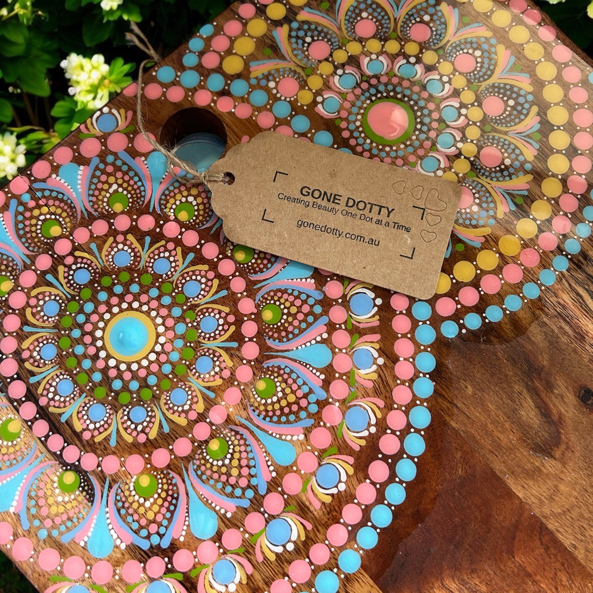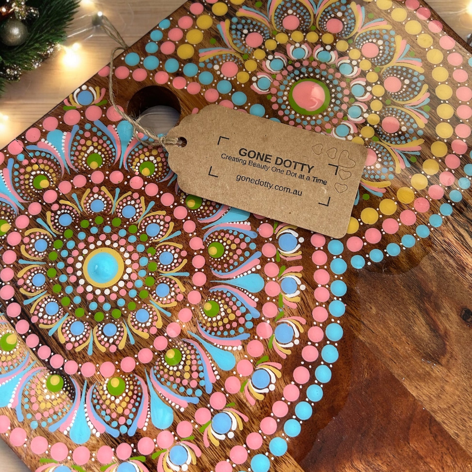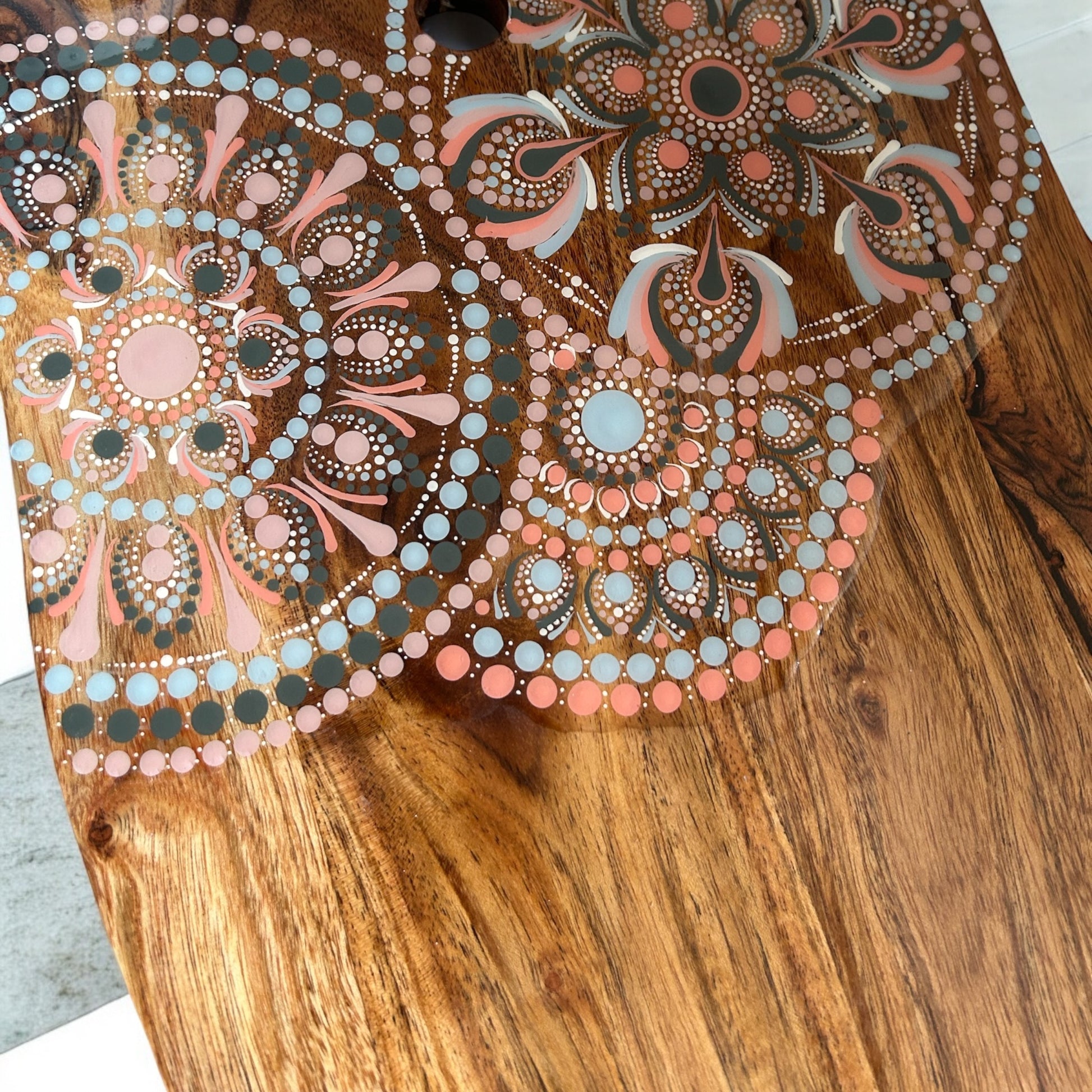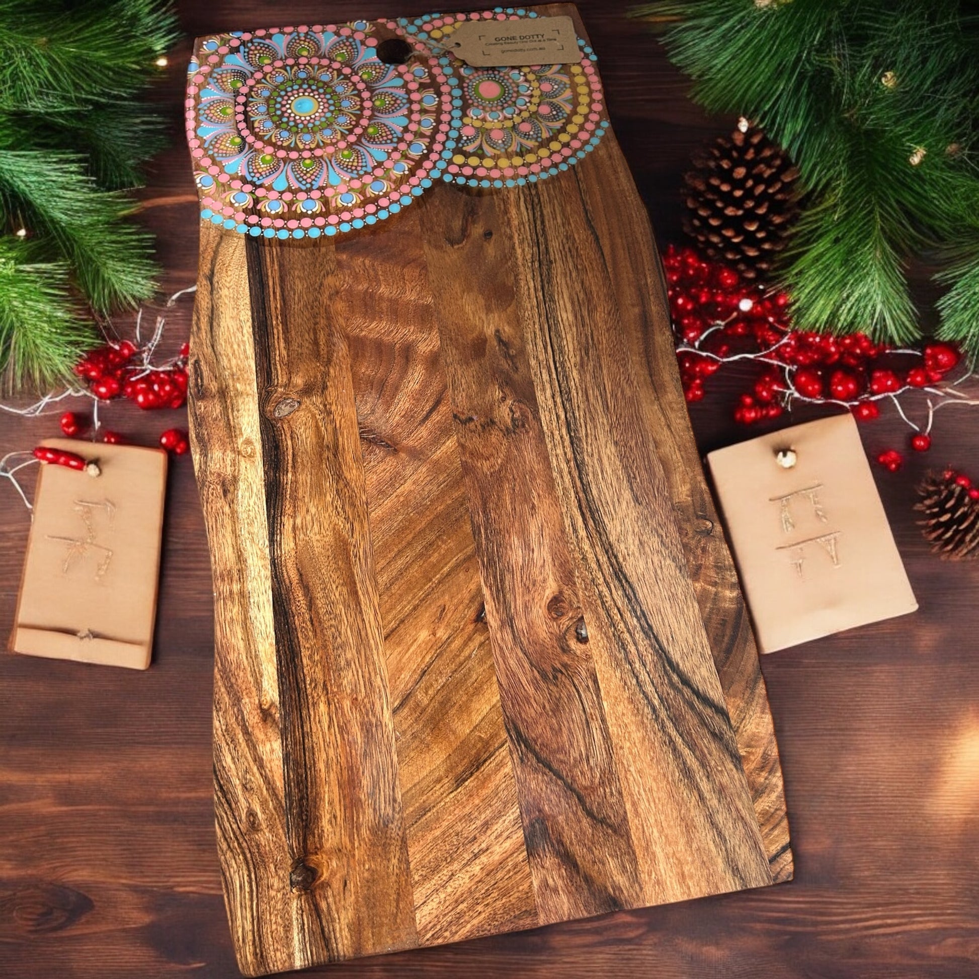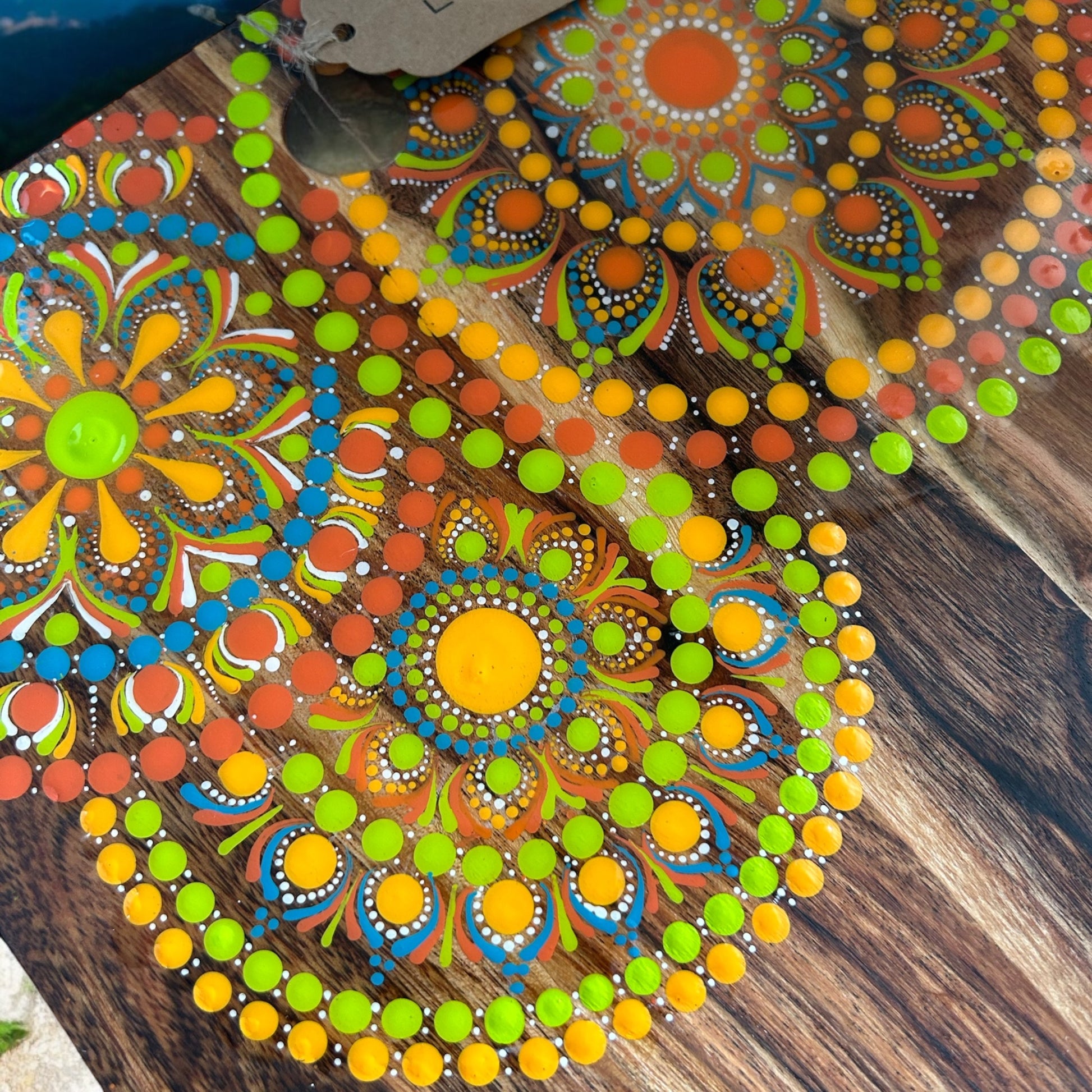 Each board features a vibrant hand painted design sealed with food-safe resin, while the acacia wood's natural beauty is preserved with a layer of vegetable oil, making it both functional and a work of art.