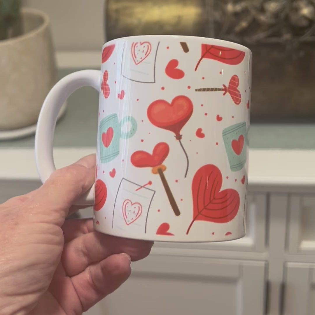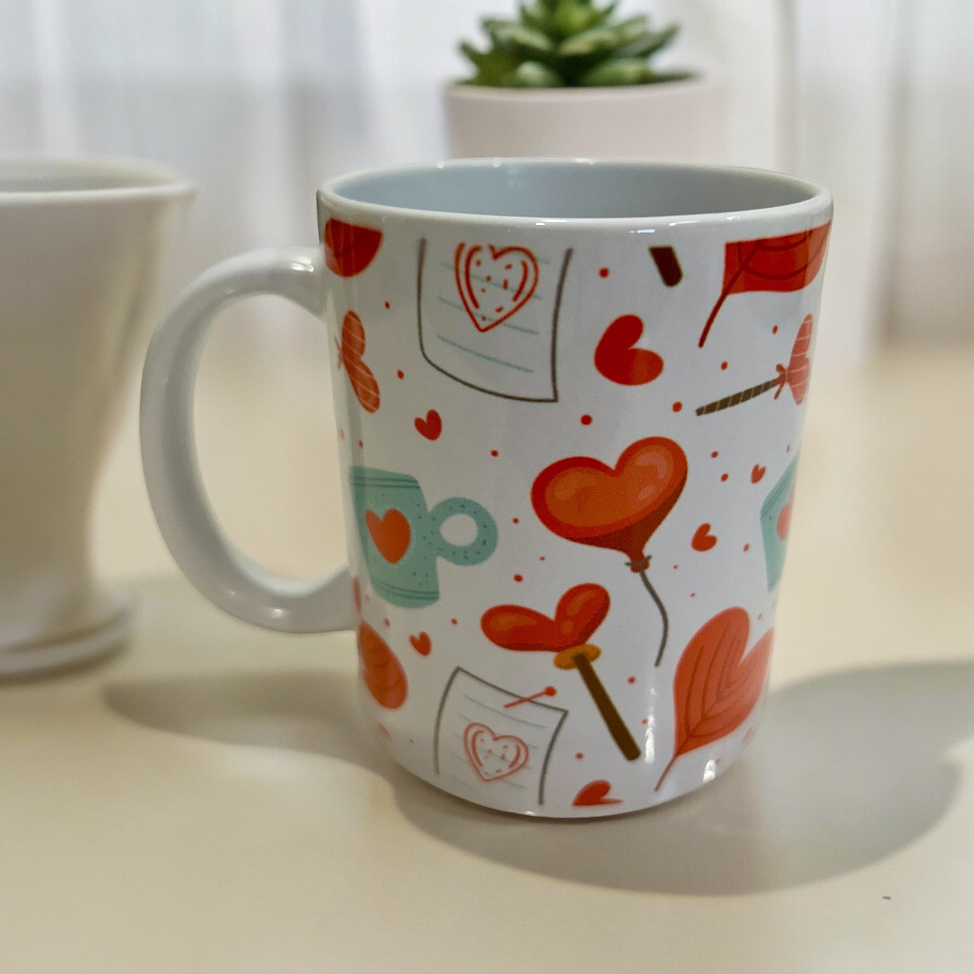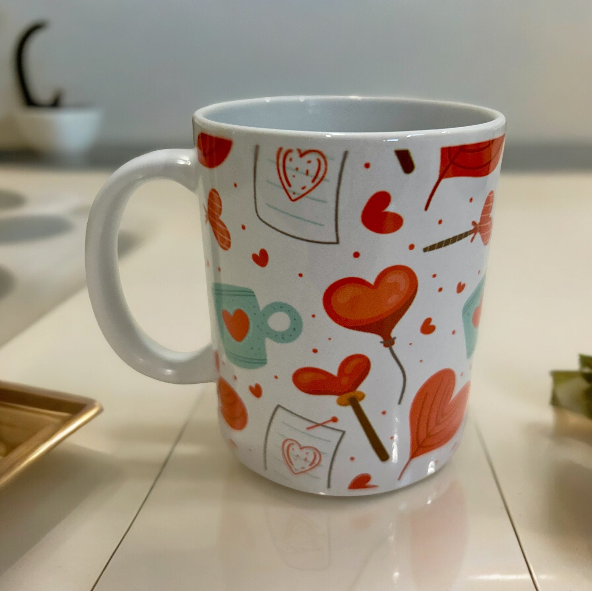 "Give the gift of love with our heart patterned Ceramic Mug! Featuring a 325ml capacity and made with non-toxic infusible ink, it's both dishwasher and microwave safe. Show your special someone how much you care with this perfect gift idea."