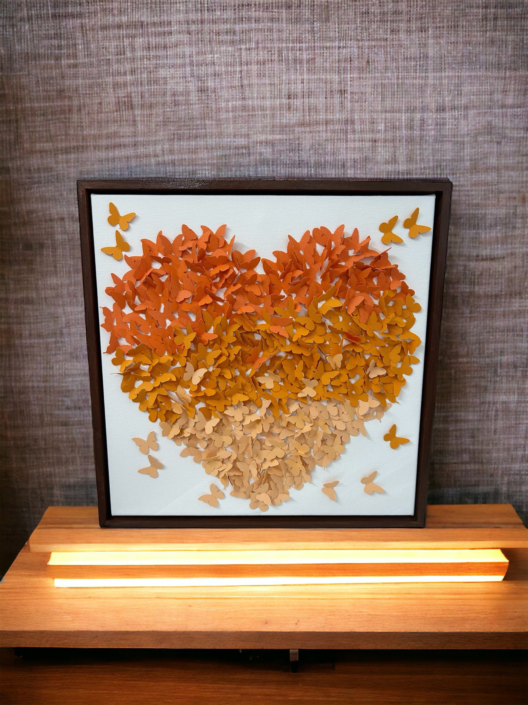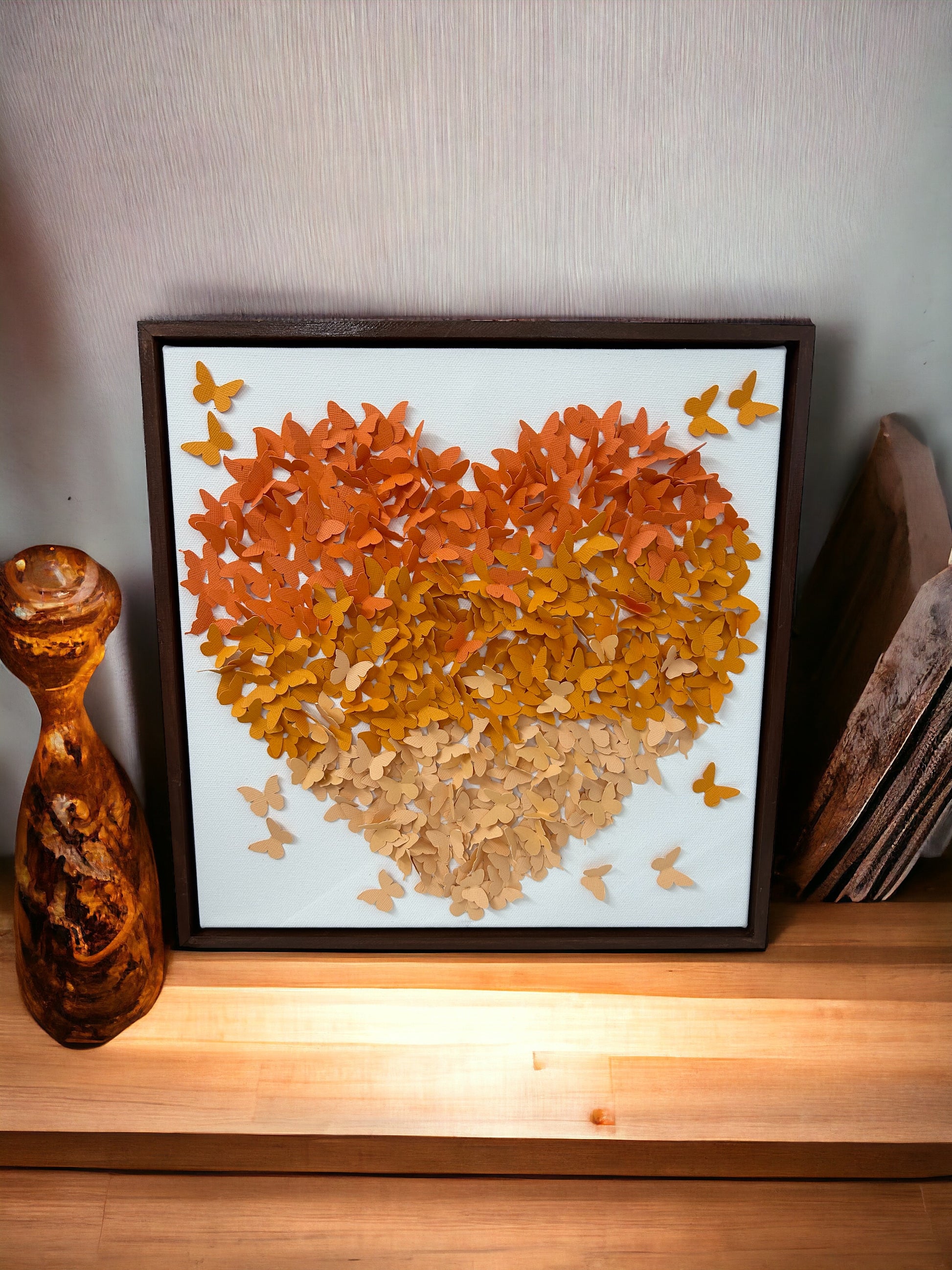 Let your walls take flight with our Cricut Butterfly Heart Wall Art. Measuring 30.5cm square, this unique piece features hundreds of tiny butterflies, hand-attached on canvas and framed with a stained wooden frame. Add a touch of whimsy and wonder to any room with this eye-catching masterpiece. (No two are exactly alike!)