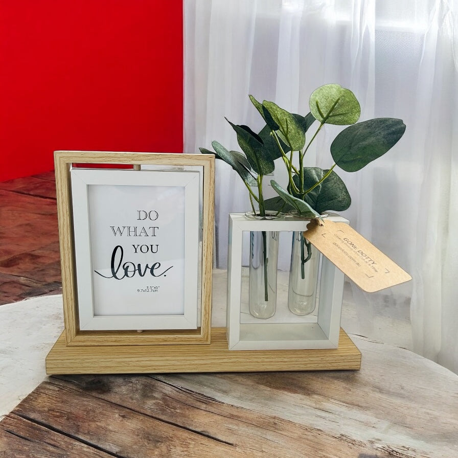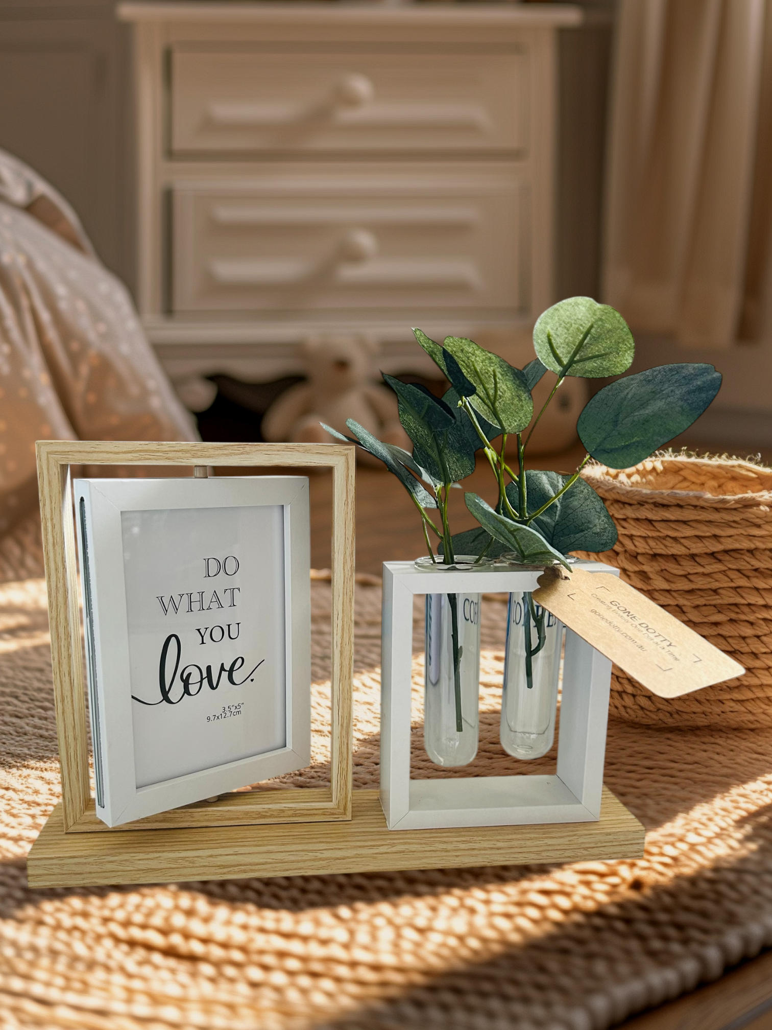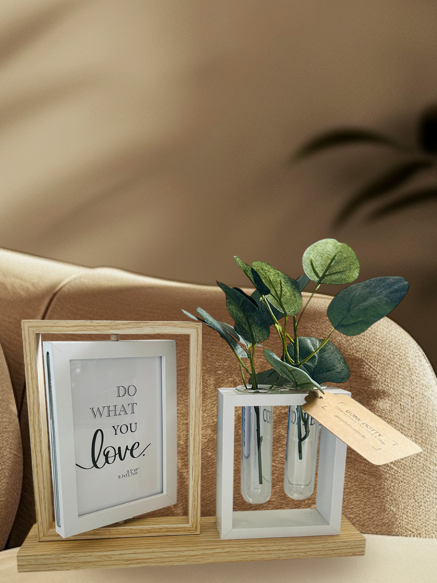 Elevate your home decor with this chic and versatile photo frame that features not just one, but two elegant vases or propagation stations. Designed to enhance any living space, this double-sided frame adds a touch of sophistication. It swivels effortlessly, allowing you to showcase two cherished photos simultaneously. Measuring at 27cm in width, 5.5cm in depth, and 18.5cm in height, this stylish piece is the perfect thoughtful gift for family and friends who appreciate a blend of functionality and aesthetics.