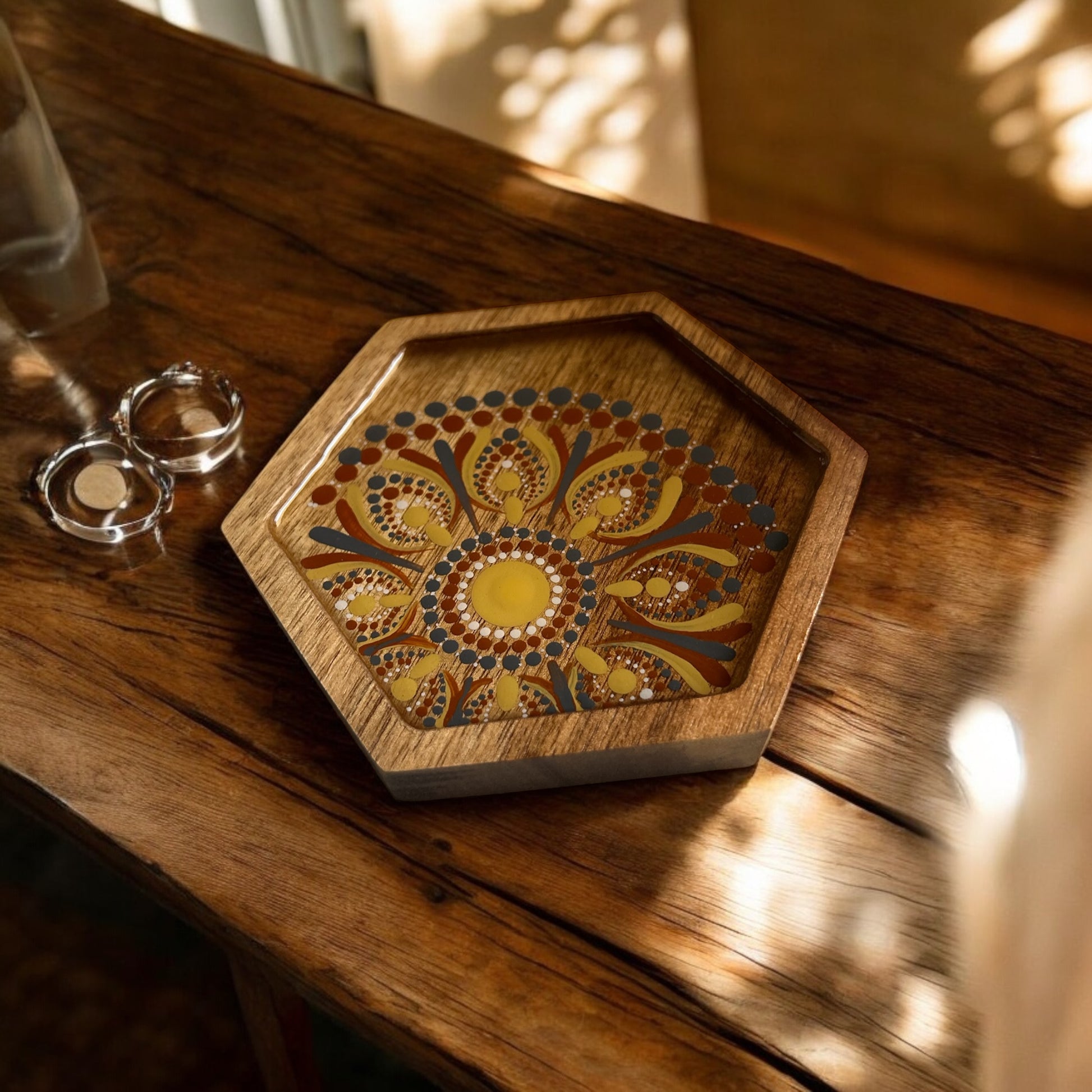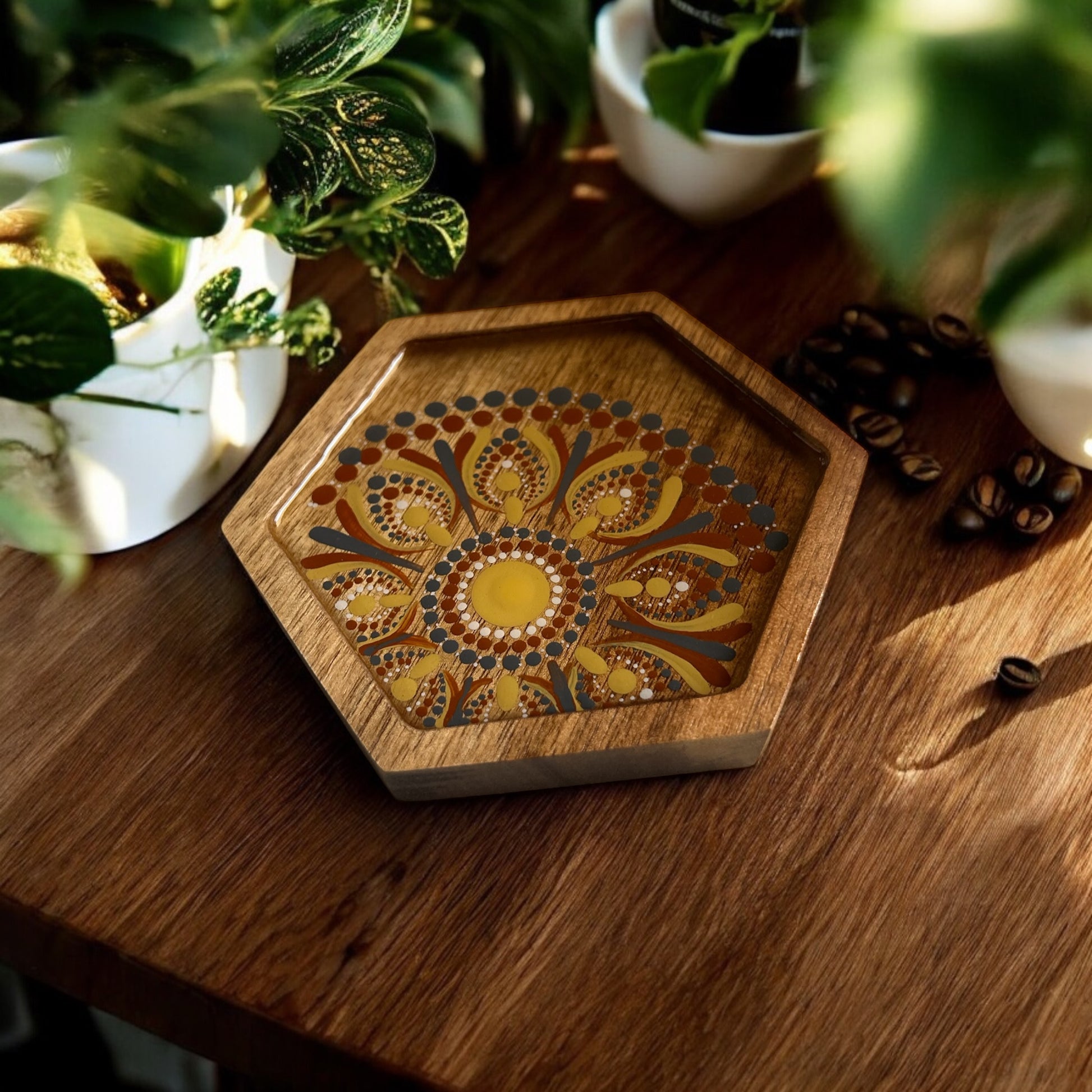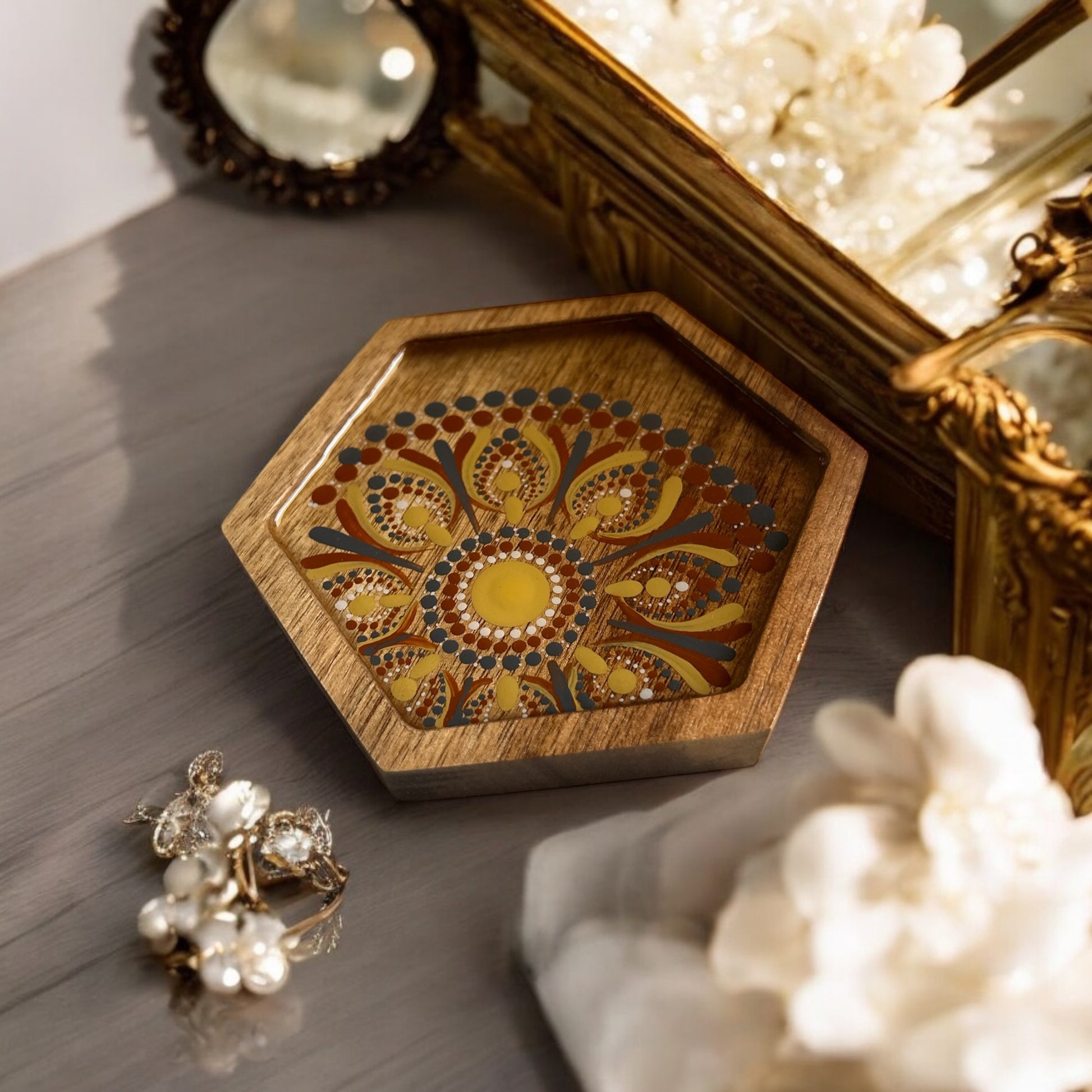 Experience the allure of this exquisite rustic wooden masterpiece, carefully crafted to captivate and serve in countless ways. Whether you're organizing your treasured jewelry, storing precious trinkets, or protecting your surfaces with a fashionable coffee coaster, this item does it all. Each piece is meticulously hand-painted and coated with a durable layer of resin, ensuring the preservation of both its beauty and functionality. With dimensions of 13cm in width and 11.3cm in height, this piece is the perfect size for a variety of purposes. Keep in mind, each creation is hand-painted with unique details, making each piece one of a kind and adding a touch of distinctiveness to your collection.