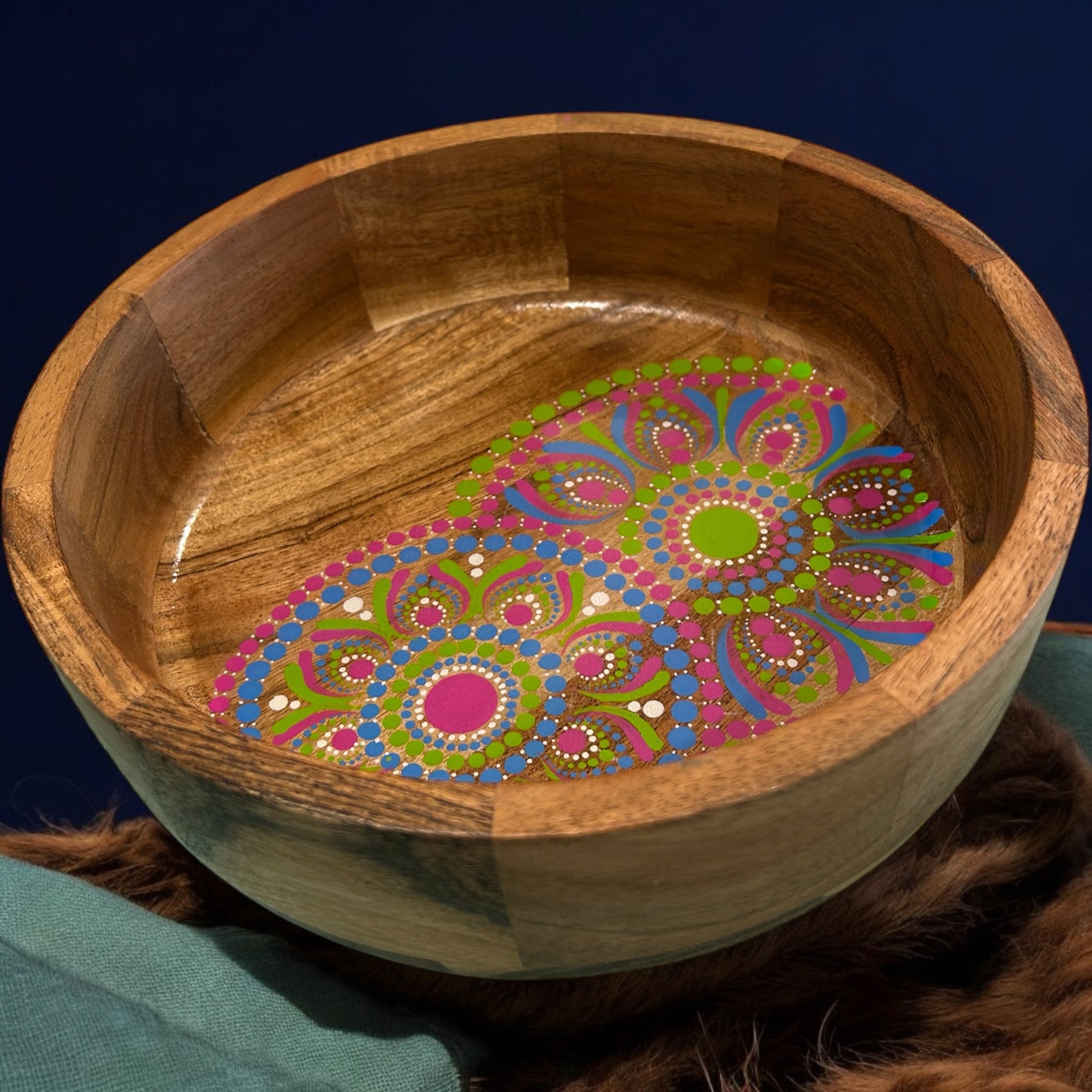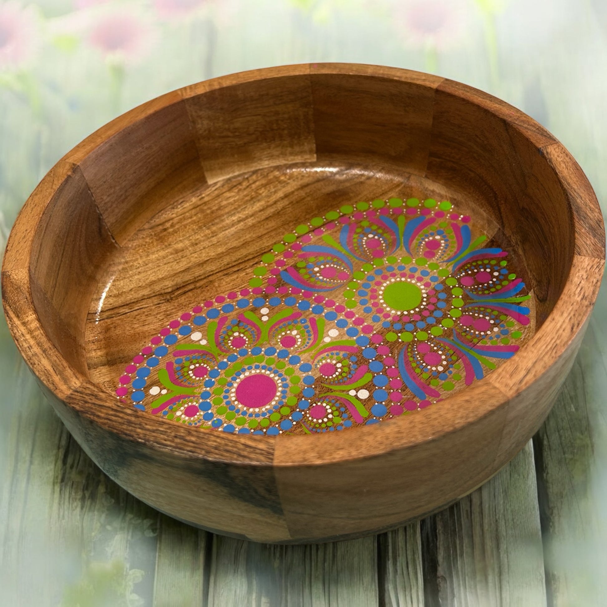 With a general size of 10cm in height and 25cm in diameter, it's as versatile as it is beautiful. The base of the bowl is covered in a layer of food safe resin which not only protects the intricate artwork but also adds a glass-like shine that enhances it elegance.