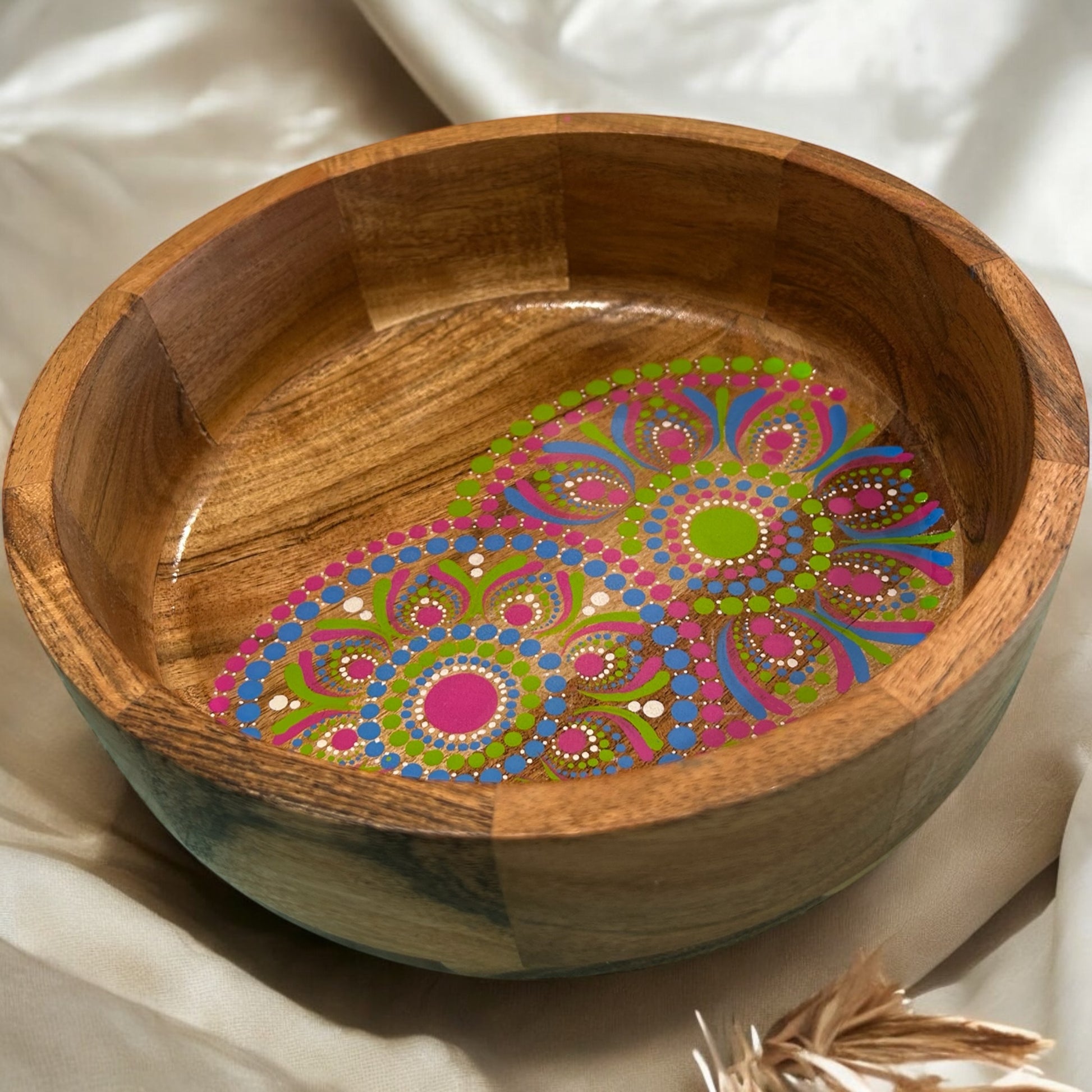 This stunning acacia and marble bowl, with its hand-painted and captivating mandala design, is a true masterpiece. Each bowl is unique, ensuring that no two are alike.